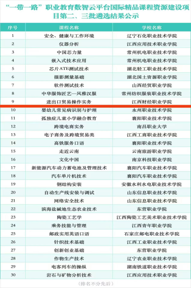 近日,“一带一路”职业教育数智云平台国际精品课程资源建设项目(第二、三批)遴选结果正式公布,我校申报的《进出口贸易操作实务》国际化课程成功入选,这标志着学校在课程资源国际化建设方面取得重要突破。
